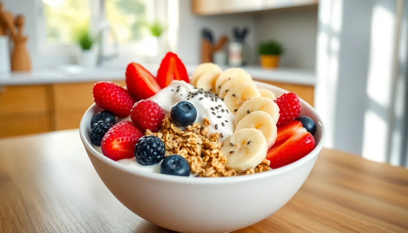 Nutritional value stands out in healthy breakfast bowls, delivering a variety of vitamins, minerals, and fiber. Creamy yogurt provides probiotics, promoting gut health. Fresh fruits, including berries and bananas, add antioxidants and essential nutrients. Granola contributes whole grains, while nuts and seeds supply protein and healthy fats. Each component plays a role in supporting wellness. Chia seeds, for instance, are high in omega-3 fatty acids, enhancing heart health. Balanced macronutrients create lasting energy, fueling the body effectively throughout the morning.